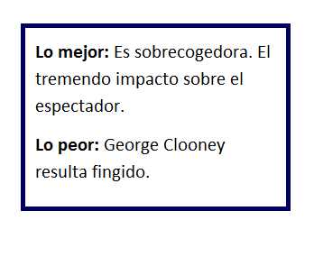 Imponente el sonido. Desde la primera transmisión de radio perceptible por mi oído izquierdo en la sala. Imponente la música. Imponente Sandra Bullock, cualquier idea preconcebida desaparece, y lo que queda es sacrificio, trabajo y buen hacer. Difícil todo ello, dada la cantidad considerable de planos secuencia.