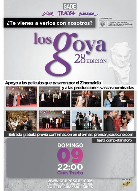 Ya está aquí la entrega de premios más esperada para el cine español, los premios Goya. Como no podíamos ser menos, también traemos nuestra quiniela para estos premios. Además, este año en Donostia se va a poder vivir de una manera muy especial esta gala, ya que los cines del Grupo Sade han organizado un evento en el cine Trueba de Gros en el que podrá ver la gala y apoyar a las películas que pasaron por el Festival de Cine. celebracion de los goya en sade