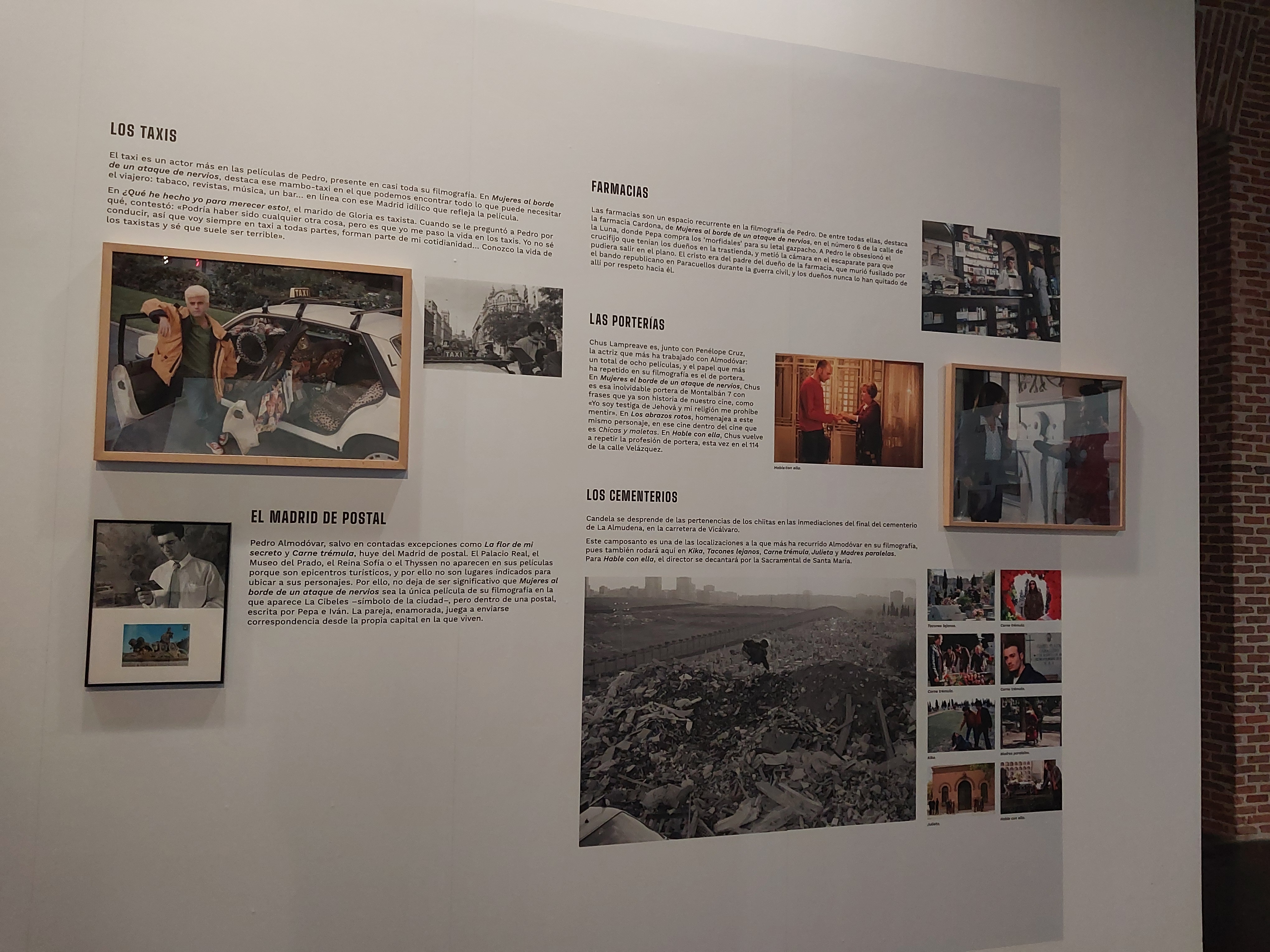La premisa de la exposición es que Madrid es una más de las «chicas Almodóvar», un club compuesto por todas las actrices que han trabajado con él y que otras actrices han aspirado a entrar. Si pensamos en una de las chicas Almodóvar, Carmen Maura puede que sea de las primeras que nos venga a la cabeza. Esta escena esta rodada en el mismo sitio en el que podemos ver la exposición, ya que la escena está grabada fuera del edificio de Conde Duque. La exposición hace un repaso muy interesante a las películas y nos cuenta los secretos de las grabaciones. Casas de amigos, la calle e incluso platós en los que la decoración tenía que emular Madrid han sido clave para que el cine de Almodóvar sea como el que es.